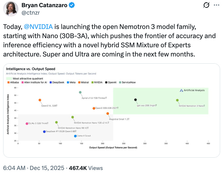 NVIDIA Nemotron 3 — Actually fully open. Weights, data, training recipes. All of it. Strategic hedge incoming.