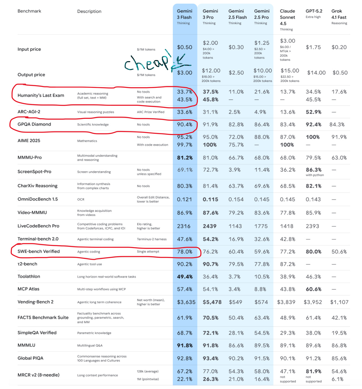 Gemini 3 Flash ships — Frontier benchmarks at Flash latency. $0.50/$3.00 per 1M tokens. Already live in Cursor, VS Code, Perplexity, Ollama. Google is moving FAST.