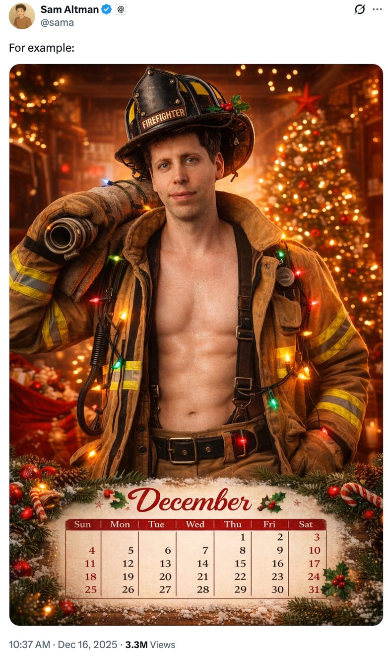 OpenAI released Image 1.5 this week, and it just claimed the #1 spot on LM Arena’s image generation leaderboard. And Sam kindly graced us with his AI-generated abs, because at this point of the year, why not!!