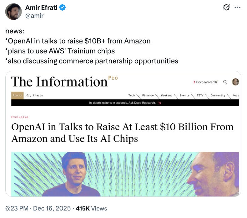 OpenAI in talks for $10B from Amazon (and perhaps a $750B valuation) — The capital arms race continues!